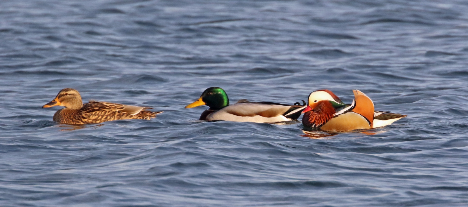 Mandarijneend achter een koppel wilde eenden. Afgelopen zaterdag in de Lek bij Everdingen