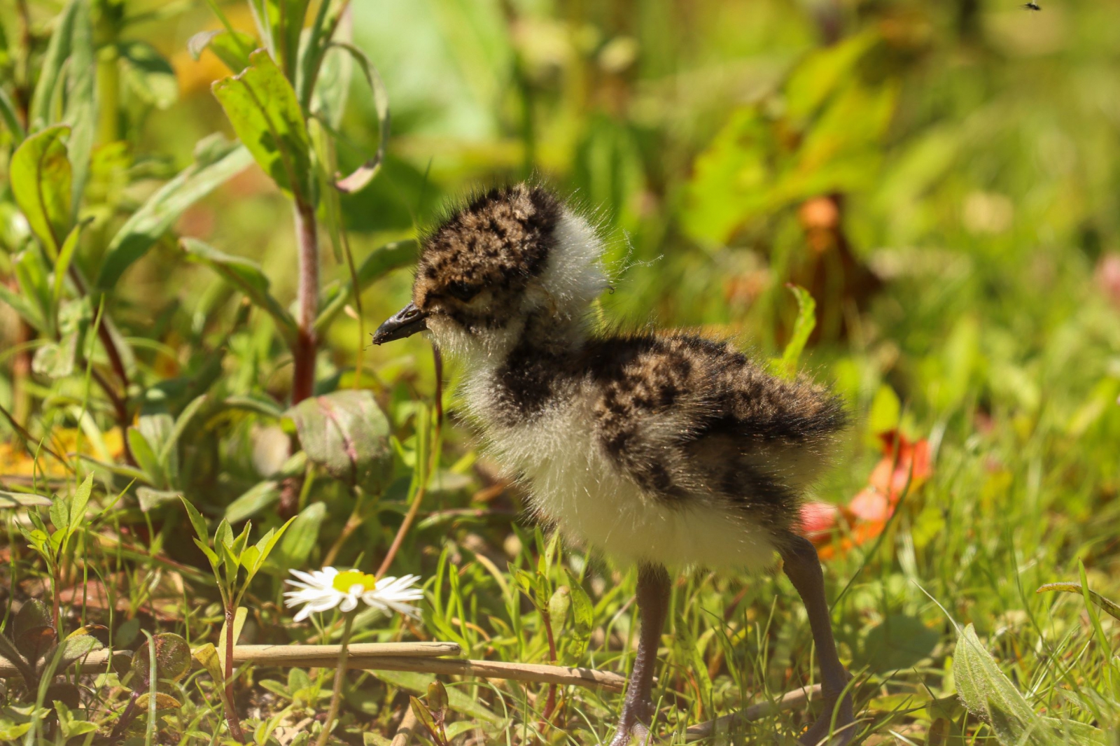 Kievitsjong op avontuur bij De zeven gaten, Honselersdijk. Moeder kievit was al een tijdje aan het roepen, maar het kleintje reageerde niet. Hij was maar een klein stukje van haar vandaan, en scharrelde vrolijk verder in het gras, tot vlakbij het hek waarachter ik verborgen zat.