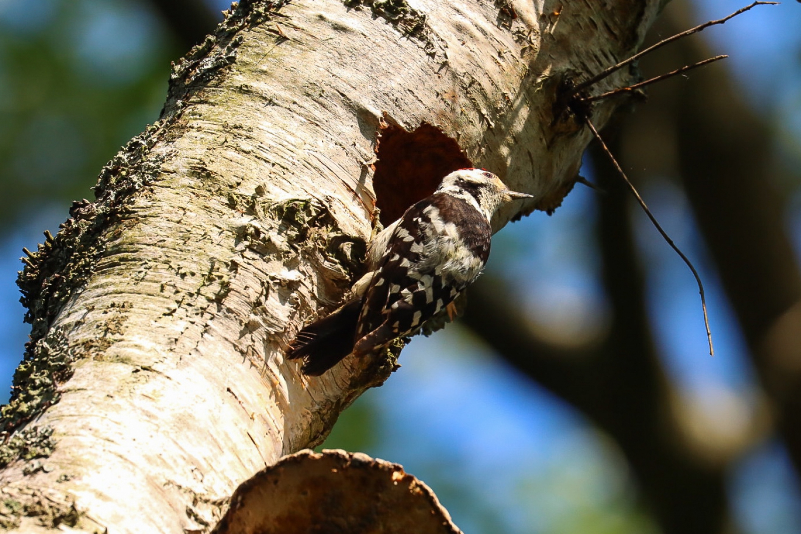 Ik hoorde de zachte roffel al van de kleine bonte specht (een mannetje, al is dat op deze foto niet goed te zien) en opeens zag ik hem voor me tegen een boom. Het zal niet zijn eigen nest geweest waar hij bij zat, maar dat kon de pret niet drukken. Voor mij was het de eerste keer dat ik er eentje op de foto kreeg. Meijendel.