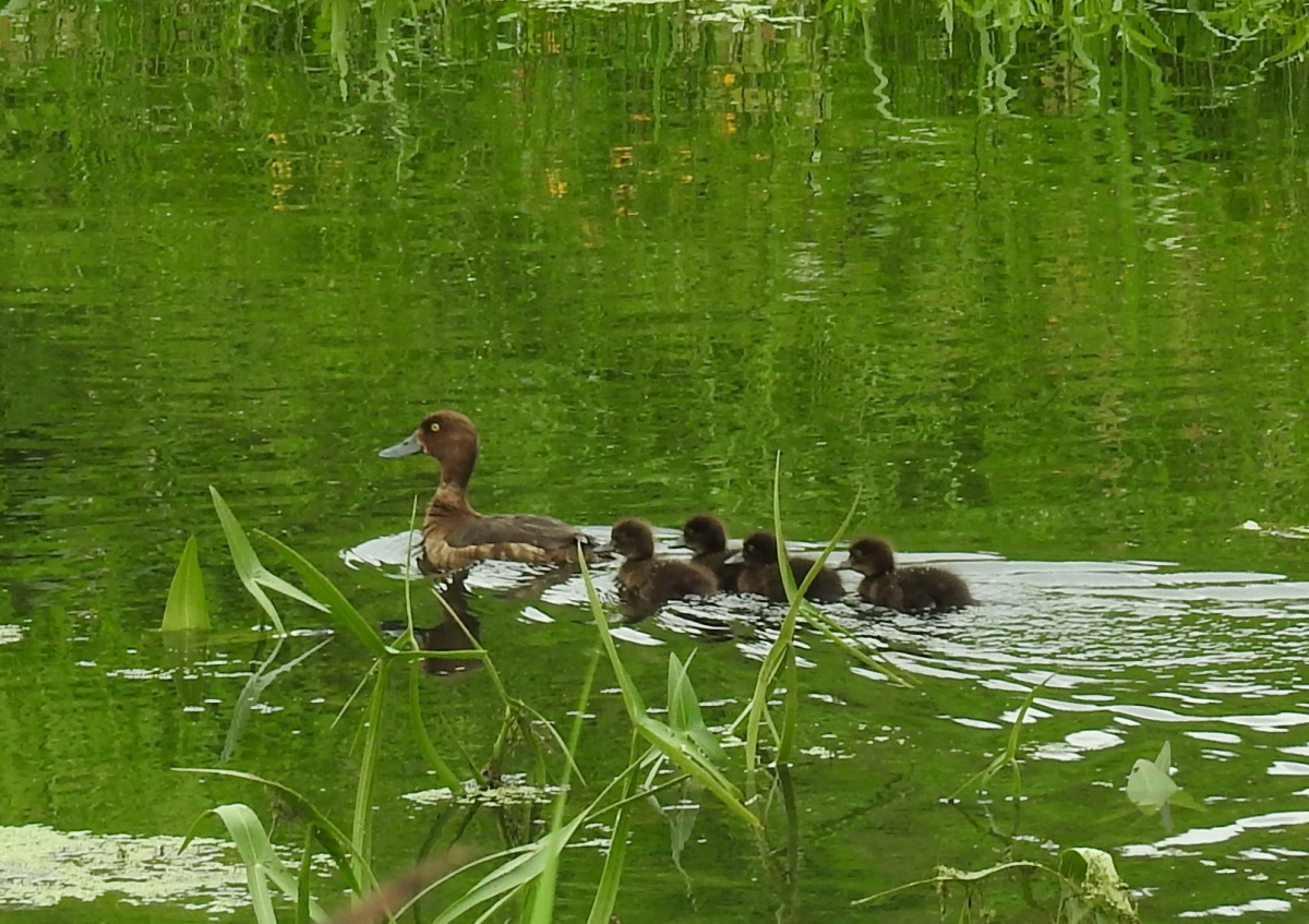 Kuifeend met jongen