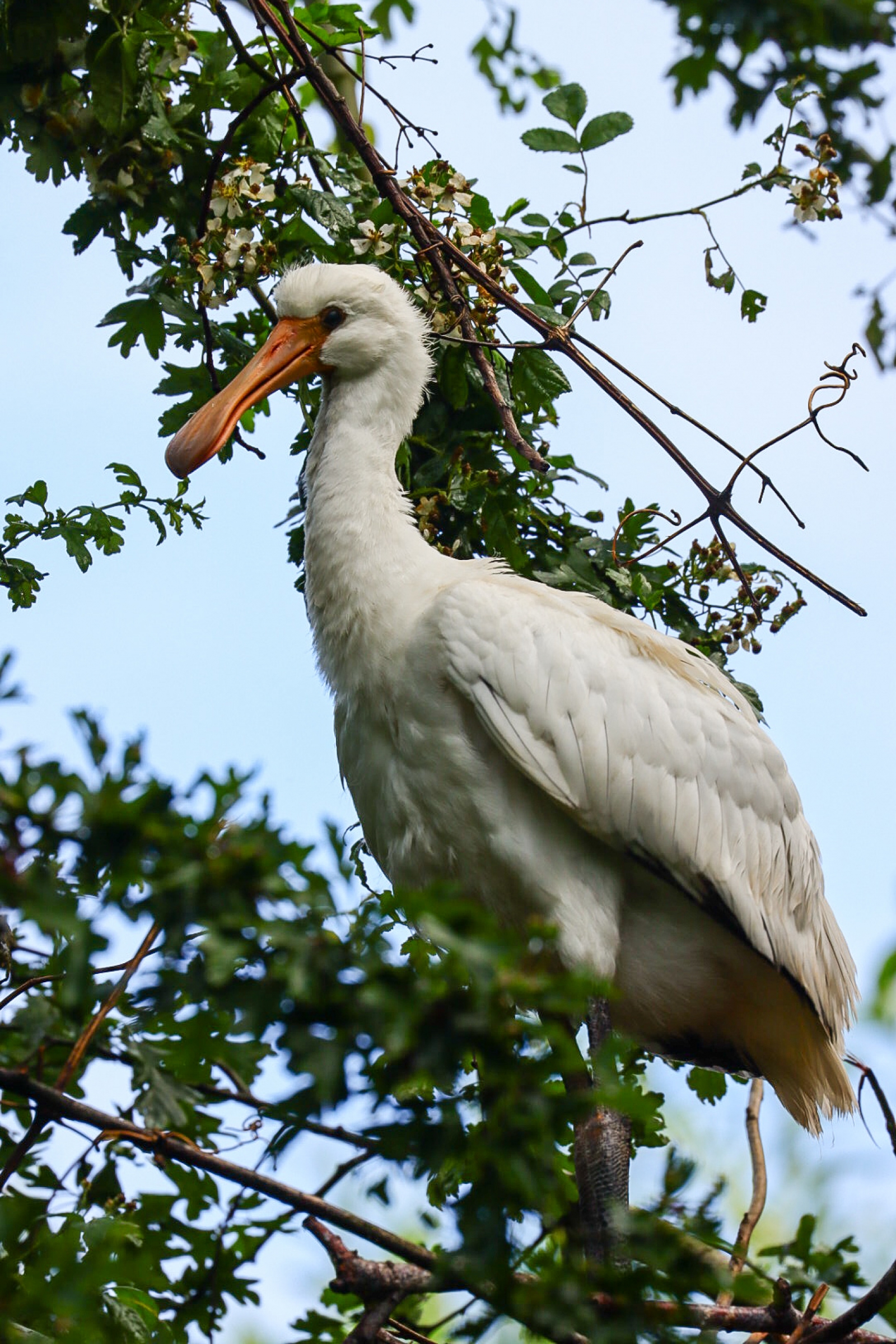 Op en rond de nesten fladderen verschillende juveniele lepelaars die wachten op de ouders met de maaltijd.