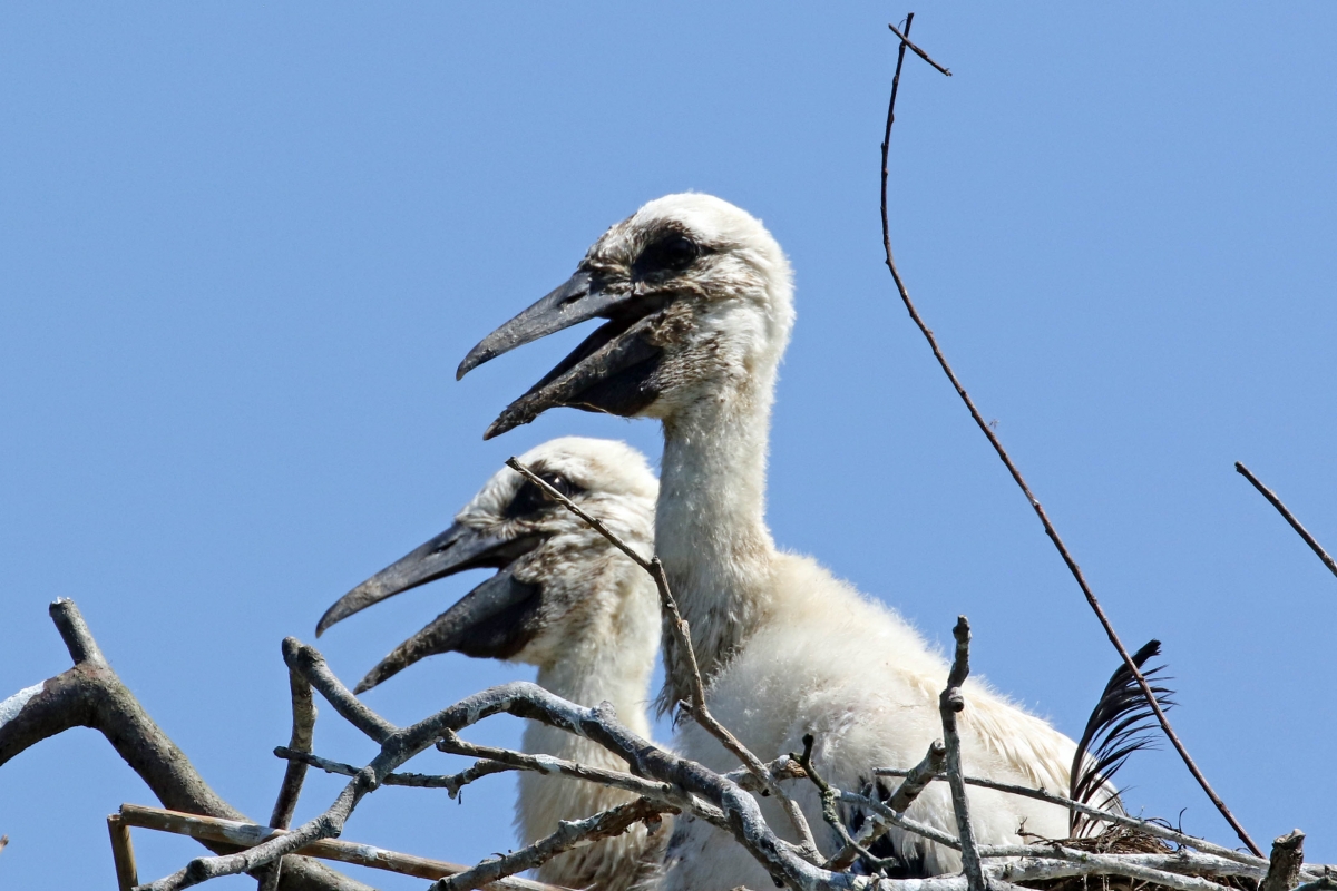 Is volkomen duidelijk, maar deze jonkies worden vanaf hun geboorte dagelijks door tientallen toeristen en bewoners bewonderd op hun hoge paal. Ik volg het nest al een tijdje en wat groeien ze snel... Toen ik de foto nam waren Pa en Ma even weg en wachten beide op de komst van voer.