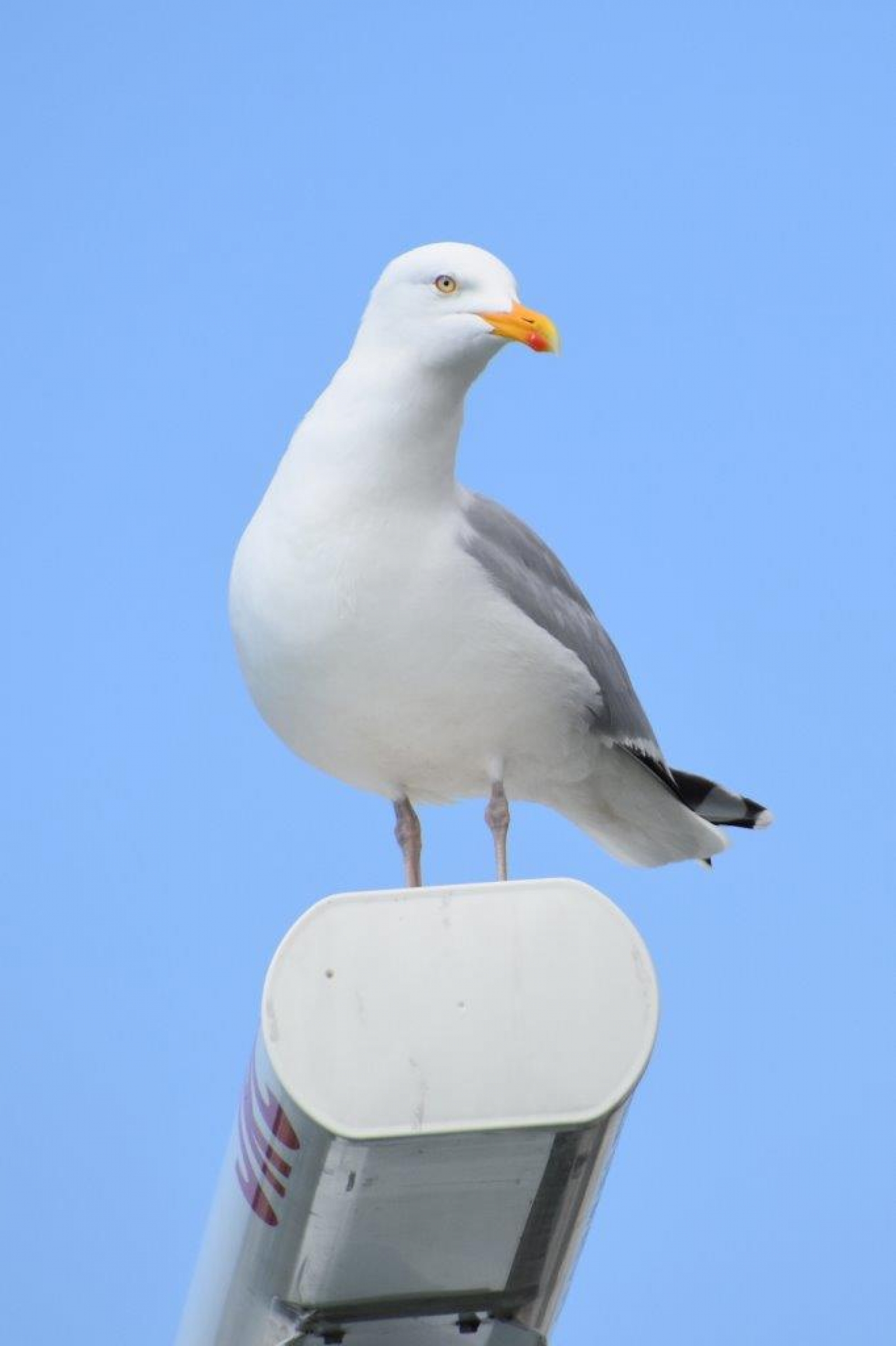 De meeuw steekt prachtig af tegen de strakblauwe lucht.
