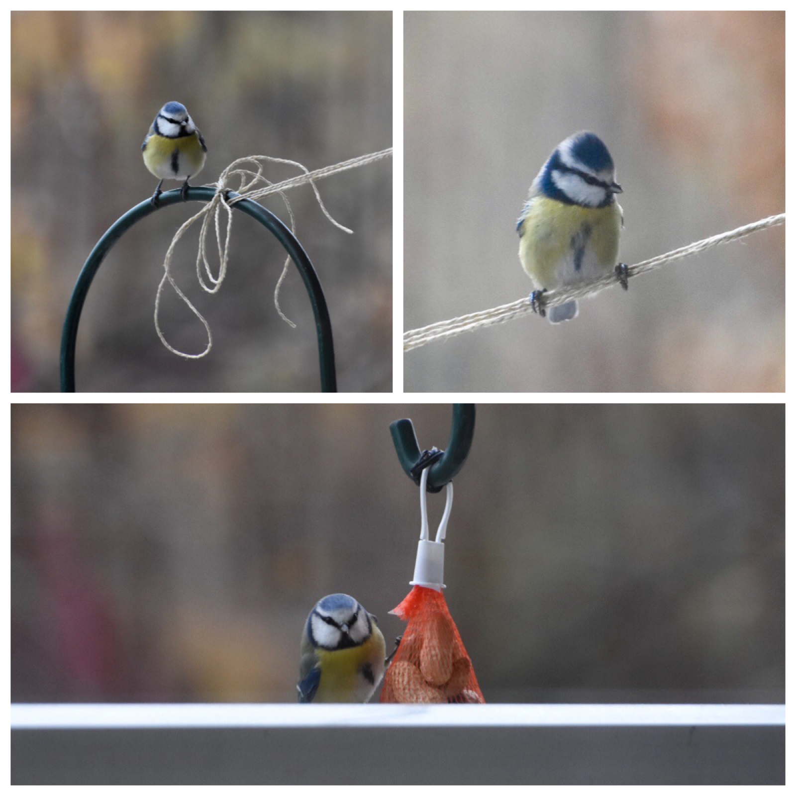 Op mijn balkon, het touwtje is gespannen omdat daar de vetbolletjes en pindanetjes aan bewegen en het voor de kauwen wat lastiger is om erbij te komen.