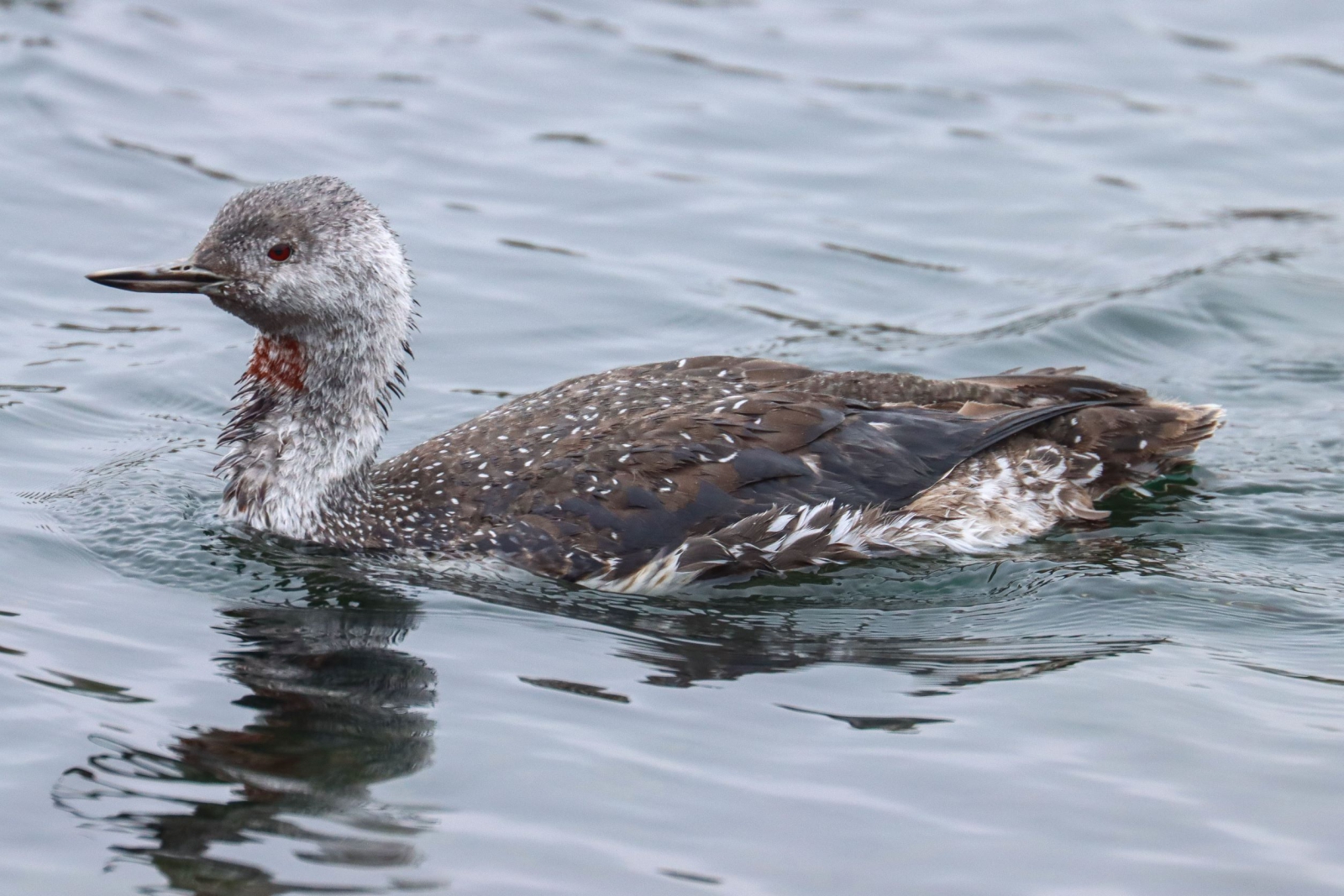 In de winter verdwijnt de rode vlek op de keel van de roodkeelduiker. Bij dit exemplaar was het vlinderstrikje van het zomerkleed nog gedeeltelijk aanwezig. Grevelingen, 9 november.