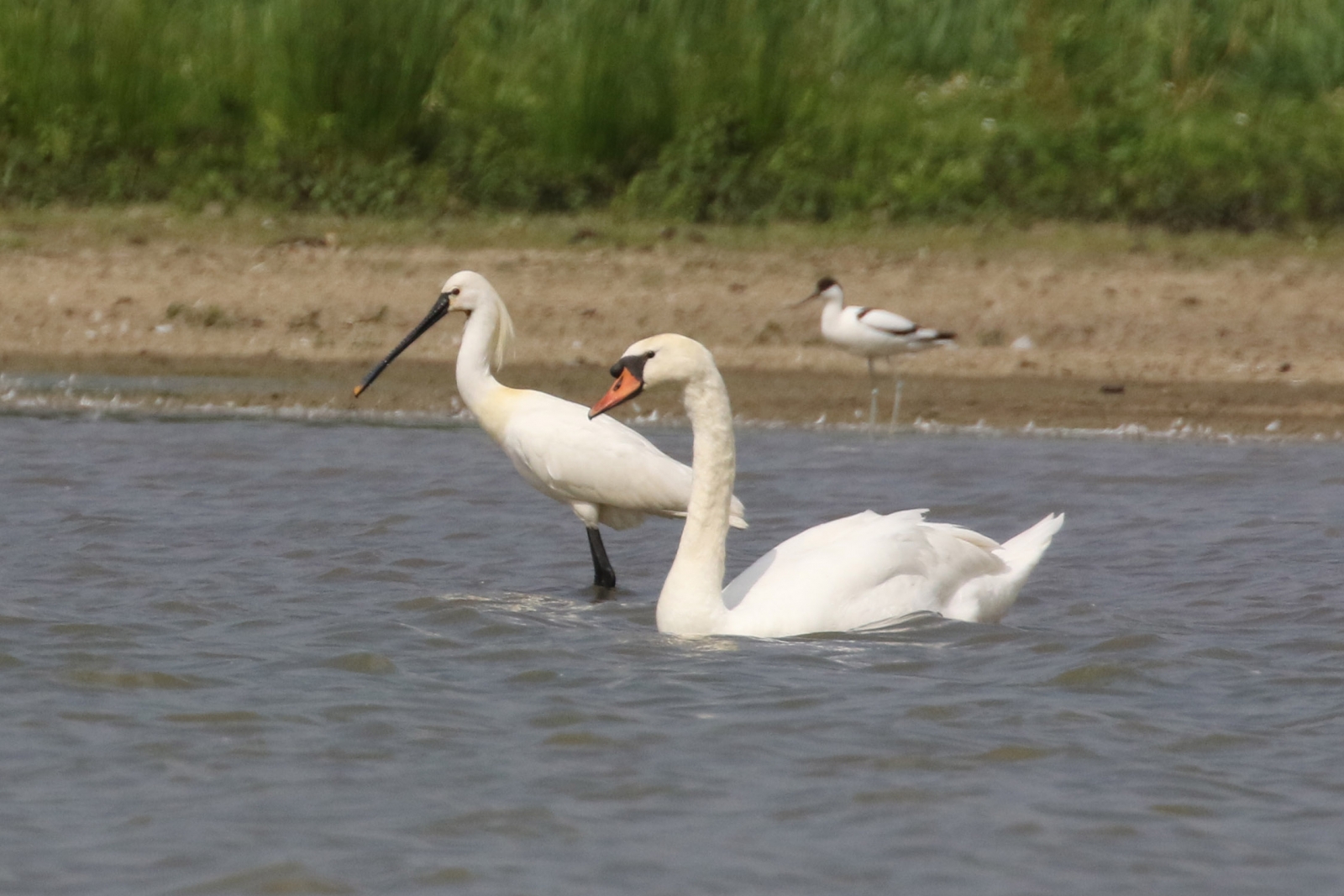 Lepelaar, knobbelzwaan en achteraan een kluut