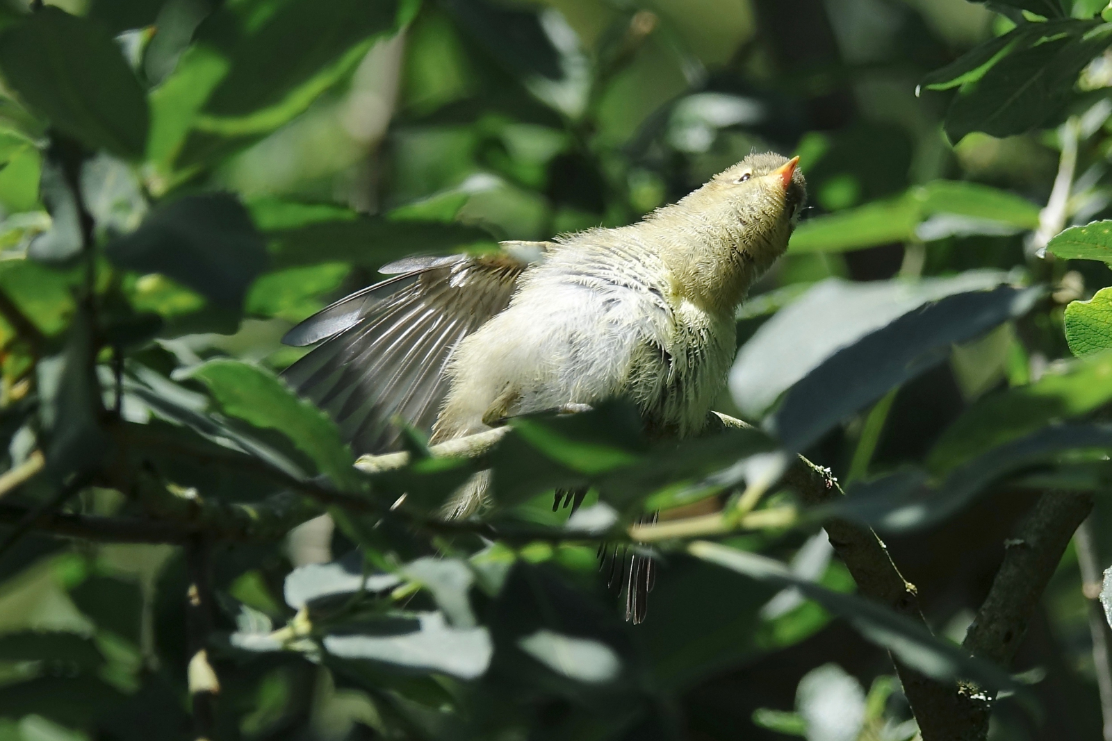 Deze jonge Tjiftjaf rekt en strekt zich tussen het gebladerte tijdens het bedelen om voedsel.