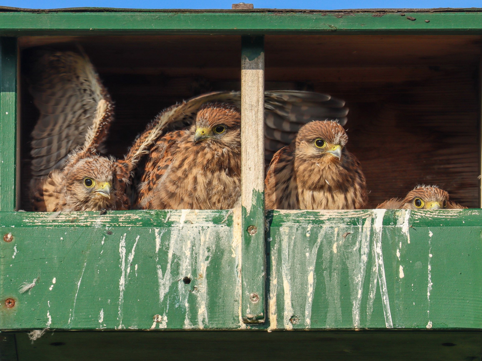 Er wordt regelmatig gefladderd in de nestkast van de torenvalkjes in de duinen bij Den Haag. Wanneer er een insect langs komt vliegen, draaien vier koppies mee. Nog even, en ze de eerste vliegt er achteraan.