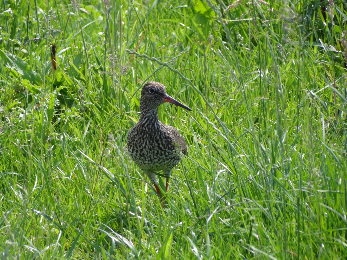 Jonge tureluur aan het scharrelen in het hoge gras en nog niet bang voor mensen!