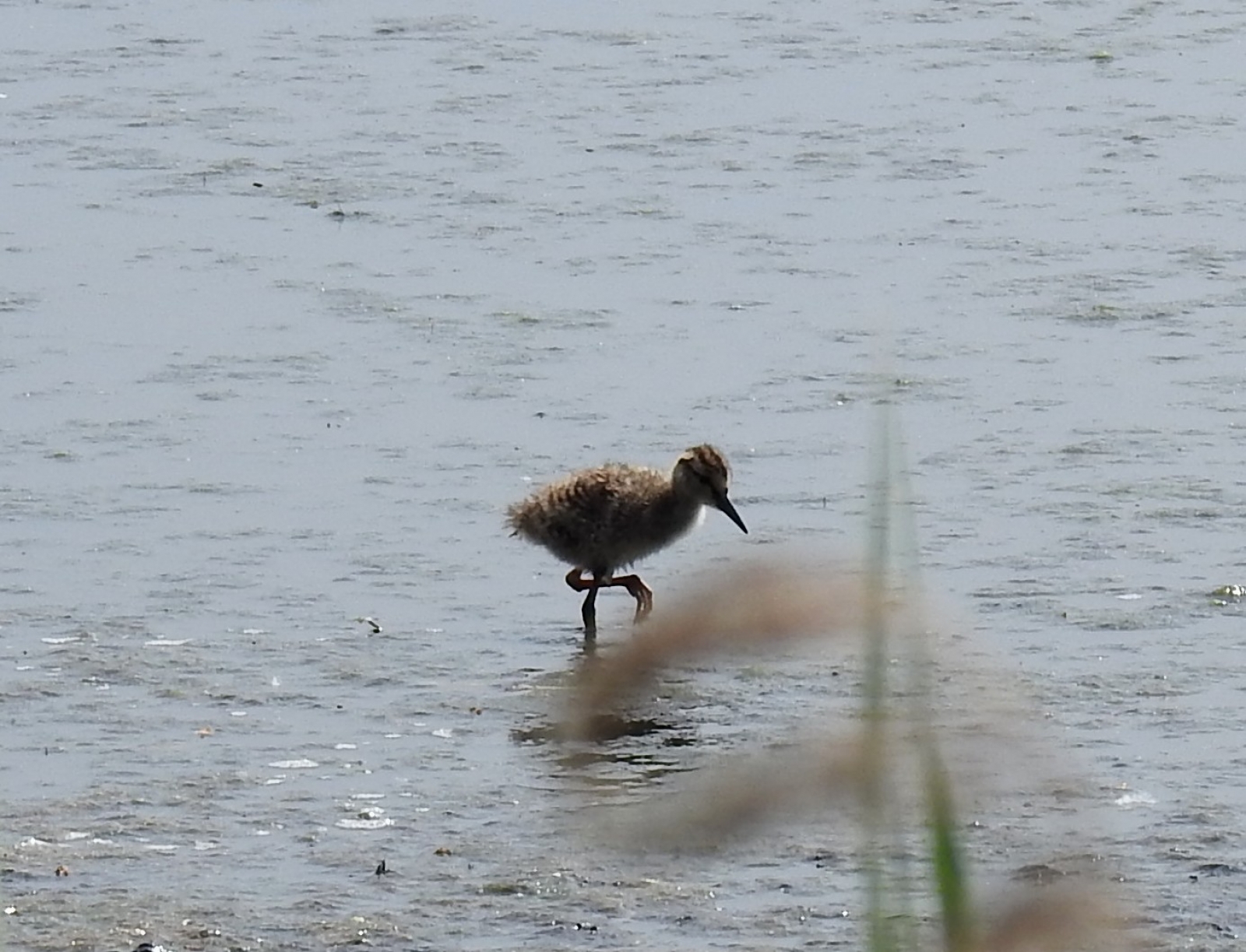 Een tureluur met twee jonkies foeragerend tussen het riet. Het was heel lastig om scherp te stellen.