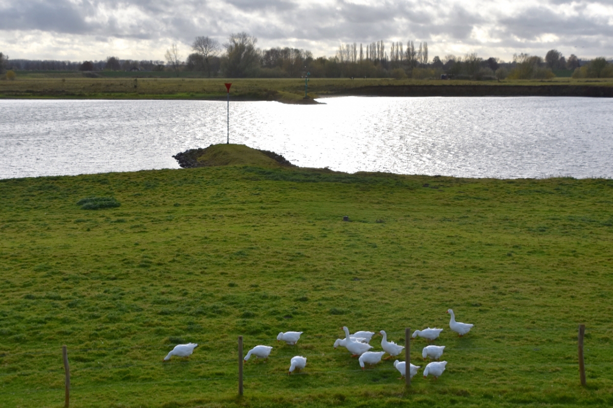Langs de Lek zat een grote groep witte ganzen.