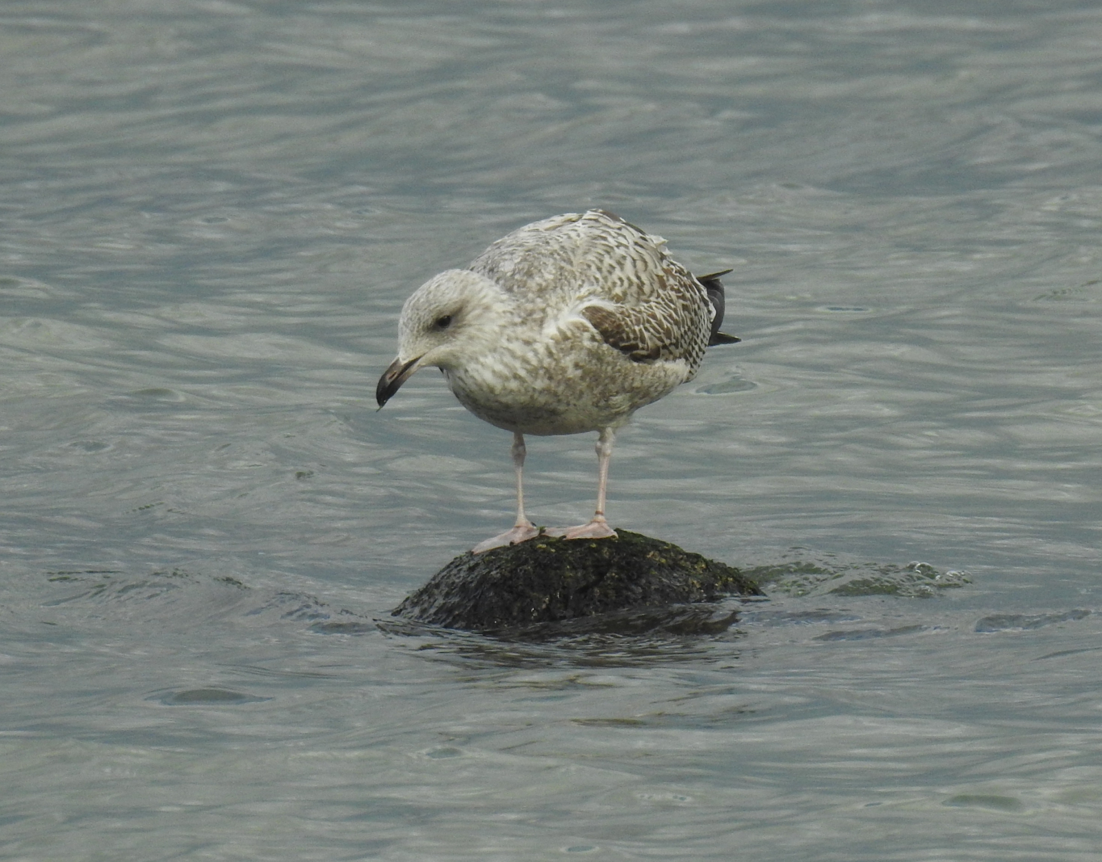 Zilvermeeuw op een rotspunt die net boven het water uitsteekt.
