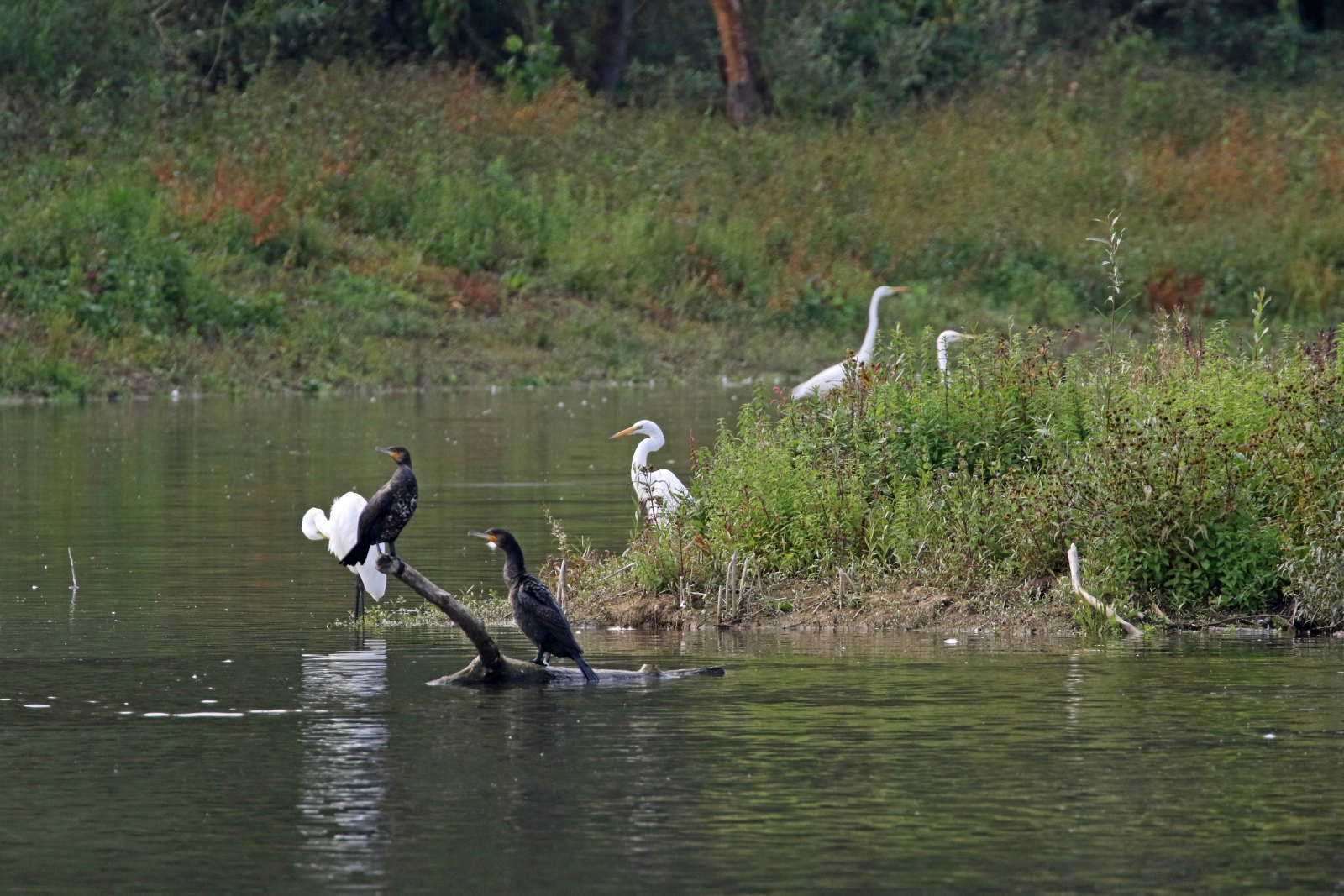 Aalscholvers en grote zilverreigers