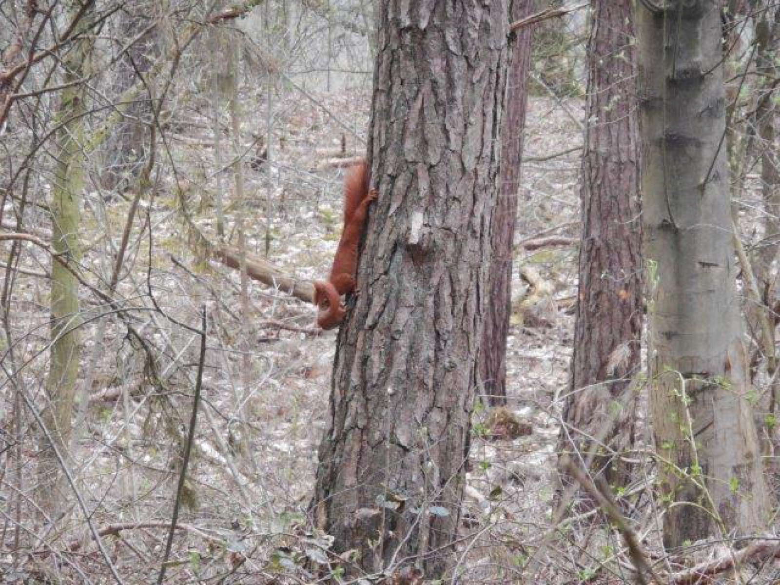 9 april 2018 in de bossen bij Reuver, Noord Limburg. Eekhoorn die in zijn bek een jong vast heeft en het heel snel naar boven in de boom sjort.