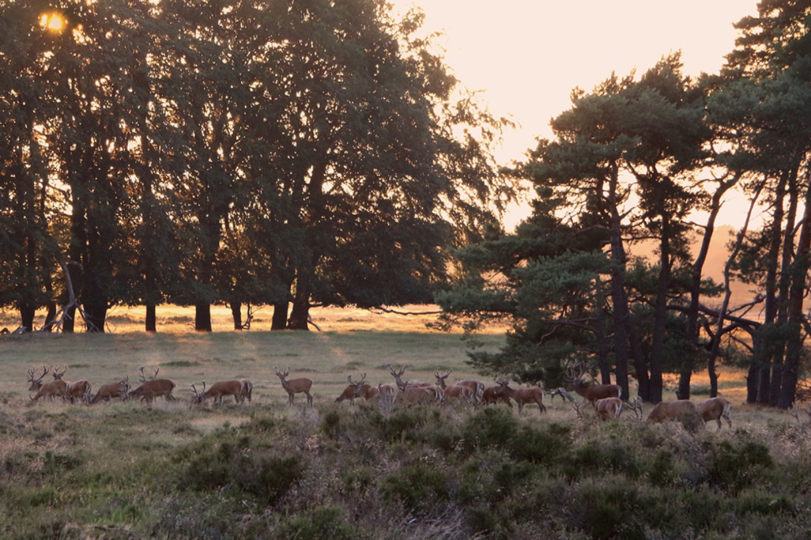 Een kudde edelherten op een mooie zomeravond op de Hoge Veluwe