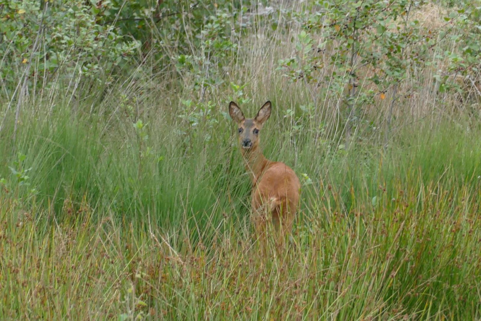 Na dat deze reegeit vlak voor mij het zandpad was overgestoken zonder mij ook maar enigszins op te merken (de wind stond gunstig) ging ze rechts naast het zandpad staan grazen. Toen ze op een gegeven moment opkeek maakte ik deze foto en verdween ze ook meteen. Een gelukstreffer..