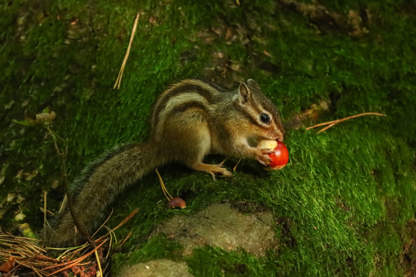 mars4i Geplaatst op 05-10-2021 om 16:43 Mooie series van grondeekhoorns. Bruinrode kastanje steekt mooi af tegen het groene mos.Las dat het aantal eikels en beukennootjes dit jaar veel lager dan normaal is. Dus hij/zij moet maar een goed voorraadje aanleggen ;-)
