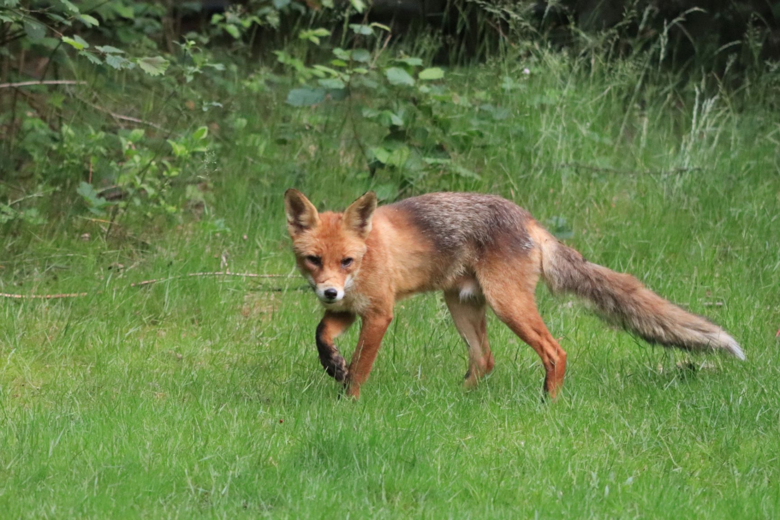 De vos op zijn dagelijkse ronde. Gespot op de Veluwe om 21.20 uur vanuit mijn vakantiehuisje.